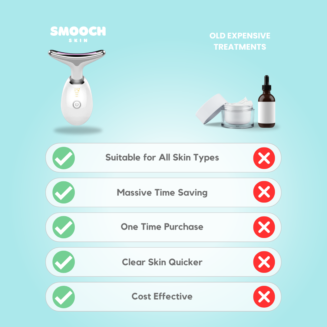 Struggling with acne? We’ve all been there! Smooch Skin both diminishes and shields your skin from future breakouts. Its powerful light therapy fights acne causing bacteria, resulting in a sweet farewell to blackheads and bumps. Get ready to wave goodbye to acne for good, embracing clear, radiant skin that empowers your confidence!